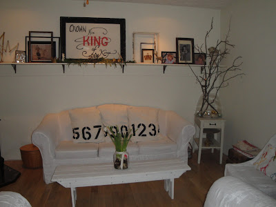 Only piece of furniture left in my living room that is not white. Found at a garage sale for $15. I would have slipcovered it by now but I really want to reupholster it. Think I could manage that?? And finally, the whole room.